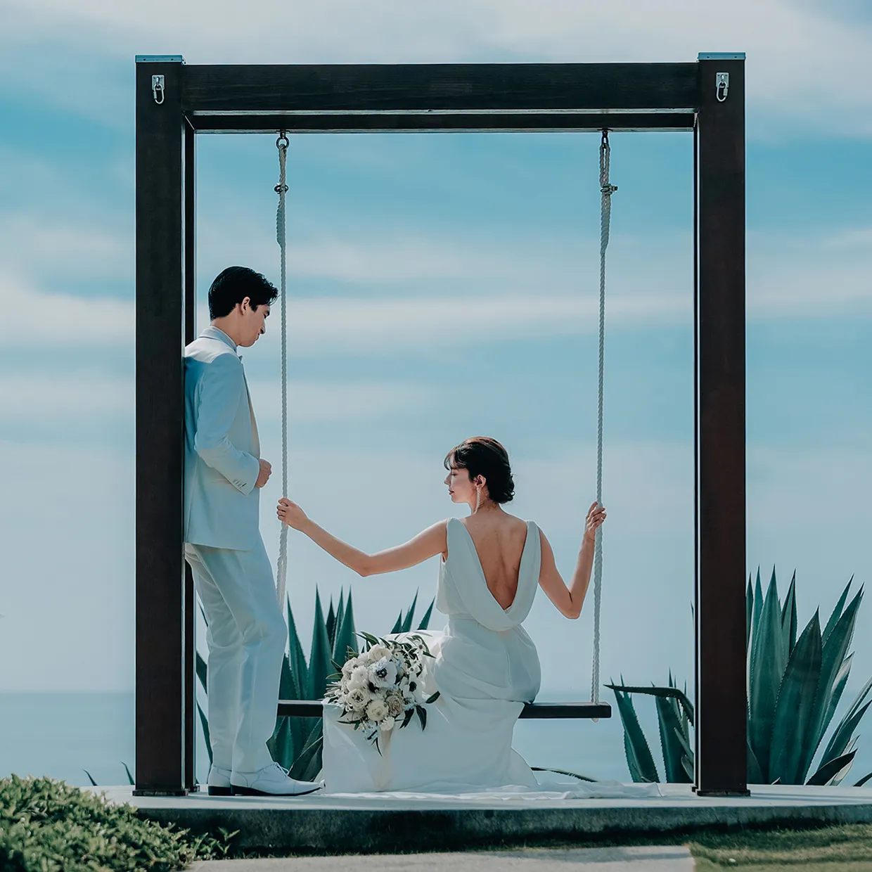 高台に佇む海と空のブランコ