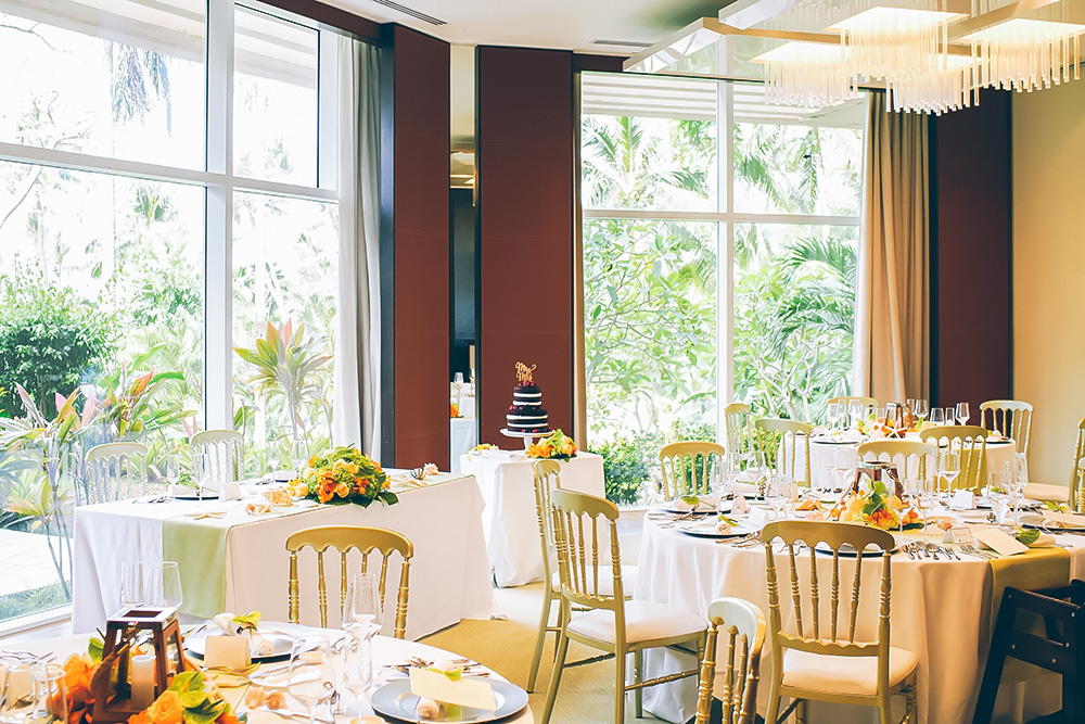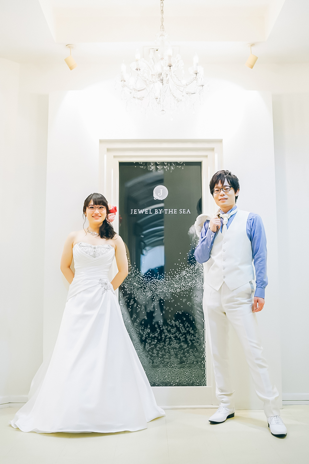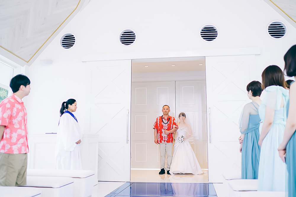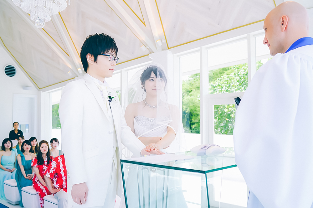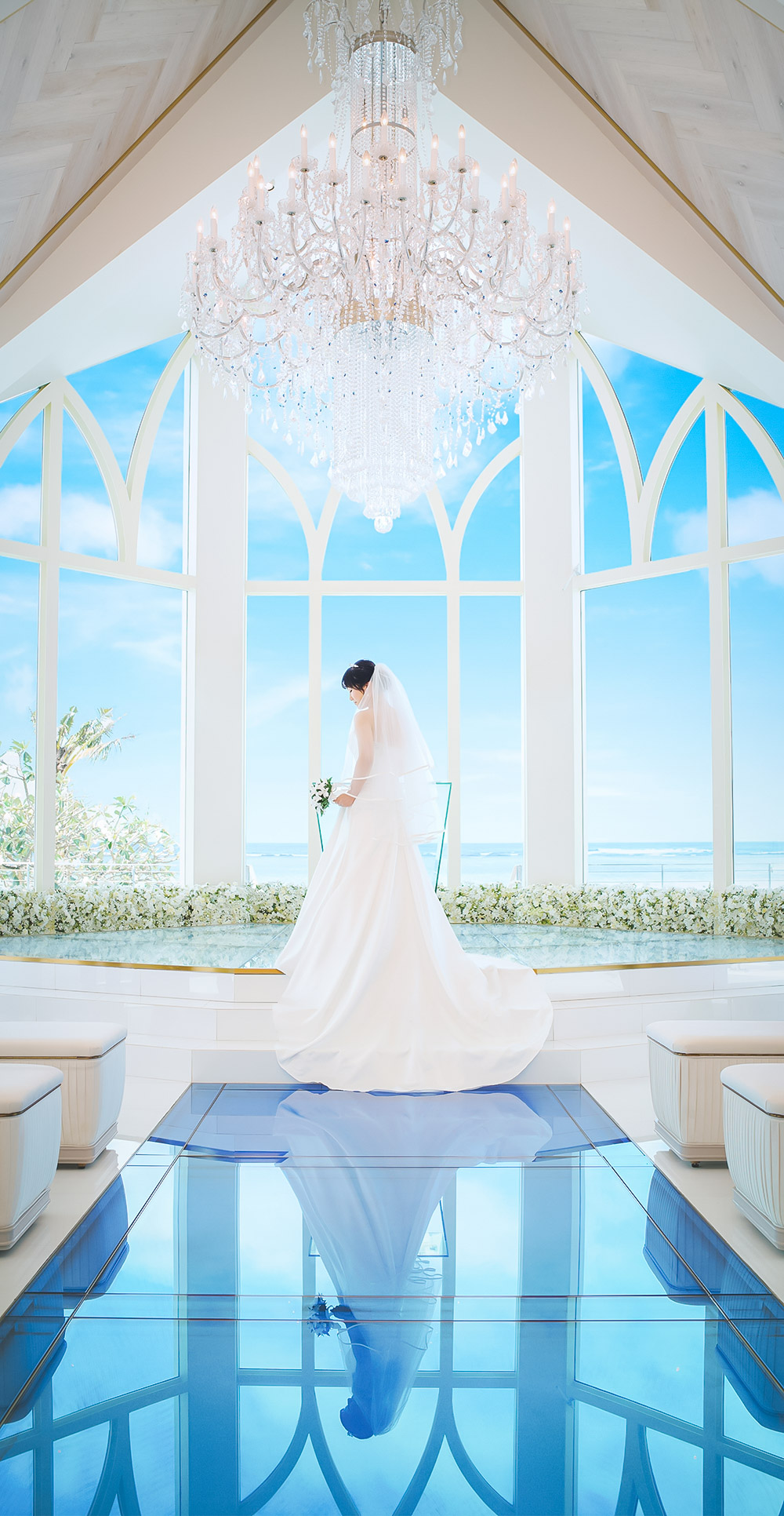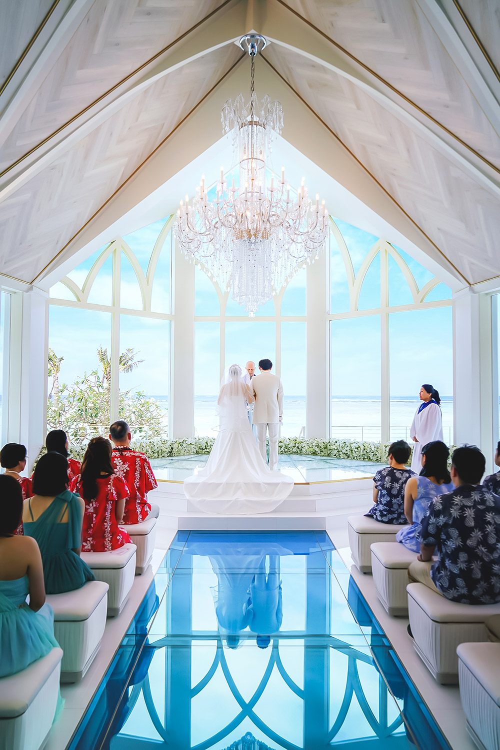 クリスタルのシャンデリアが輝く祭壇に キラキラと輝く海を臨めるチャペルでの挙式はふたりの特別な思い出に